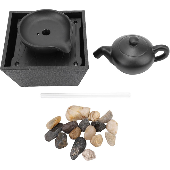 ۱ عدد پایه اصلی آبنما، ۱ عدد لوله شفاف، ۱ عدد قوری، ۱ بسته سنگ تزئینی